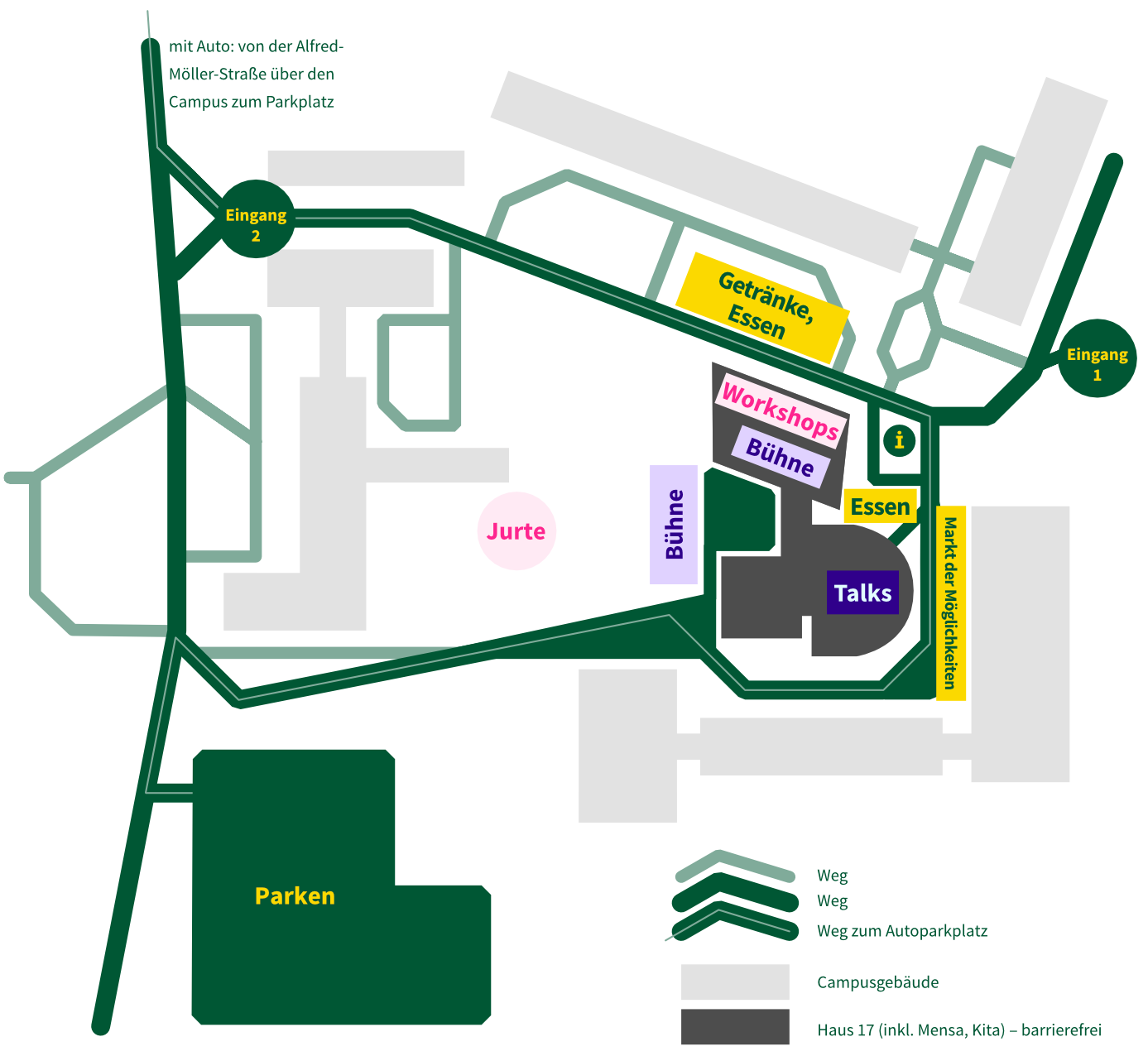 Im Rahmen des Moduls Einführung in die nachhaltige Entwicklung (ENE) hat eine Studierendengruppe ein Konzept entwickelt, um das Festival für alle zugänglich und inklusiv zu gestalten. Das bedeutet: Wir wollen, dass jede*r die Angebote nutzen kann – egal, ob ihr Unterstützung bei der Anfahrt, beim Workshop oder bei der Teilnahme braucht. Das Ergebnis des Moduls findet ihr als Lageplan hier auf der Webseite.